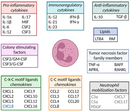 Neutrophils are the body’s first line of defense against pathogens, e.g., bacteria and fungi, and comprise 50–70% of the white blood cell population in human circulation. They are essential immune cells, and patients that lack (mature) neutrophils often succumb to severe opportunistic bacterial infections [1]. Neutrophils contain at least four types of granules: azurophilic/primary-, specific/secondary-, gelatinase/tertiary-, and secretory-granules and are, therefore, together with eosinophils and basophils, also known as granulocytes [2]. The different classes of granules are formed sequentially during neutrophil differentiation and contain different proteins important to pathogen killing (Figure 1) [2]. In addition to granule proteins, neutrophils also produce various cytokines and chemokines important for, e.g., pathogen killing and the attraction of leukocytes, respectively (Figure 2). Cytokines comprise a large group of secreted pro- and anti-inflammatory factors, grouped based on their structural homology, the similarity of their receptors and/or function (Figure 2). Chemokines are a subgroup of cytokines whose generic function is to induce cell migration.