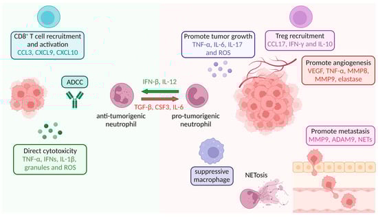 Classical views of neutrophils in cancer define them as either anti- or pro-tumorigenic, also known as N1 or N2 tumor-associated neutrophils (N1 and N2 TANs), respectively (Figure 5). Pro- and anti-tumorigenic neutrophils can be distinguished based on their cytokine repertoire. Anti-tumorigenic neutrophils produce cytokines that can promote CD8+ T cell recruitment and activation, e.g., CCL3, CXCL9 and CXCL10, as well as pro-inflammatory cytokines like IL-12, TNF-α and CSF2 (Figure 5) [119,120]. On the other hand, pro-tumorigenic neutrophils upregulate CCL2, CCL3, CCL4, CCL8, CCL12, CXCL1, CXCL2, CXCL8 and CXCL16 and attract CD4+ regulatory T cells (Tregs) by secreting high levels of CCL17 (Figure 5) [121,122].