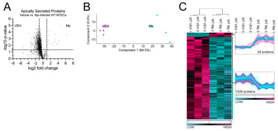 WT MTECs were infected with Mp for 48 h, after which apically secreted proteins from vehicle-treated and Mp-infected WT MTECs were identified and characterized using mass spectrometry and quantitative proteomics, respectively. To obtain a global picture of protein expression upon vehicle treatment and Mp infection, apically secreted proteins were graphed in a volcano plot to identify significant proteins (2-way ANOVA analysis; p < 0.05) with a fold change > 2 (Figure 1A). This analysis identified 1706 total apically secreted proteins from vehicle-treated and Mp-infected WT MTECs across six biological replicates. All significant proteins were graphed in a heat map to examine protein expression changes between treatment groups for the WT MTECs (Figure 1C). Of the 1458 differentially secreted proteins that were statistically different between treatment groups, Mp infection resulted in an increase in 28 proteins and a decrease in 1430 proteins by the WT MTECs (Figure 1C). Unbiased principal component analysis (PCA) of the 1458 differentially secreted proteins demonstrated consistency among the samples within each treatment group (Figure 1B) [31].