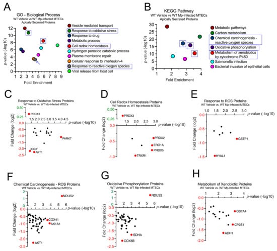 WT MTECs have decreased secretion of antioxidant proteins during Mp infection. Scatter plots of the Gene Ontology (GO)—Biological Process and KEGG Pathway enrichment findings for the proteins with significantly increased and decrease expression during Mp infection. GO and KEGG terms of interest are highlighted in blue (A,B). All proteins corresponding to the highlighted GO and KEGG enrichment terms—“Response to Oxidative Stress” (C), “Cell Redox Homeostasis” (D), “Response to ROS” (E), “Chemical Carcinogenesis—ROS” (F), “Oxidative Phosphorylation” (G), and “Metabolism of Xenobiotics” (H)—were graphed to determine expression. Proteins of interest are highlighted in red and labeled.