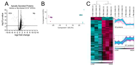 Next, we sought to determine how CC16 deficiency impacts pulmonary epithelial-driven responses during Mp infection. Apically secreted proteins from vehicle-treated and Mp-infected CC16−/− MTECs were identified and characterized using mass spectrometry and quantitative proteomics, respectively. To obtain a global picture of protein expression upon vehicle treatment and Mp infection, apically secreted proteins were graphed in a volcano plot to identify significant proteins (2-way ANOVA analysis; p < 0.05) with a fold change > 2 (Figure 3A). This analysis identified 1707 total apically secreted proteins from vehicle-treated and Mp-infected CC16−/− MTECs across six biological replicates. All significant proteins were graphed in a heat map to look at protein expression changes between treatment groups for the CC16−/− MTECs (Figure 3C). Of the 946 significantly secreted proteins, Mp infection resulted in an increase in 911 proteins and a decrease in 35 proteins by the CC16−/− MTECs (Figure 3C). Unbiased principal component analysis (PCA) of the 946 differentially secreted proteins demonstrated consistency among the samples within each treatment group (Figure 3B) [31].
