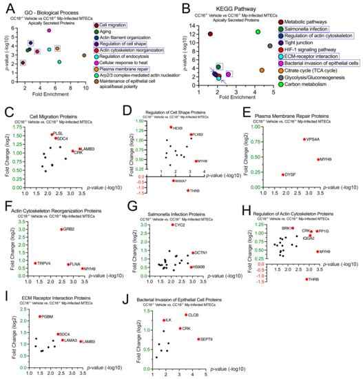 CC16−/− MTECs have increased secretion of airway remodeling and bacterial invasion proteins during Mp infection. Scatter plots of the Gene Ontology (GO)—Biological Process and KEGG pathway enrichment findings for the proteins with significantly increased secretion by the CC16−/− MTECs during vehicle treatment and Mp infection. GO and KEGG terms of interest are highlighted in blue (A,B). All proteins corresponding to the highlighted GO and KEGG enrichment terms—“Cell Migration” (C), “Regulation of Cell Shape” (D), “Plasma Membrane Repair” (E), “Actin Cytoskeleton Reorganization” (F), “Salmonella Infection” (G), “Regulation of Actin Cytoskeleton” (H), “ECM Receptor Interaction” (I) and “Bacterial Invasion of Epithelial Cell” (J)—were graphed to determine expression. Proteins of interest are highlighted in red and labeled.