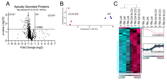 Next, we compared proteins secreted by both WT and CC16−/− MTECs during Mp infection to better understand how CC16 impacts pulmonary epithelial-driven responses during Mp infection. Based on our previous experiments showing that CC16−/− mice infected with Mp have increased airway remodeling, compared to infected WT mice [20,21], we sought to determine if during Mp infection, CC16-sufficient (WT) MTECs would be protected from epithelial-driven airway remodeling responses compared to CC16−/− MTECs. Additionally, based on prior publications, we expected that WT MTECs would have an increased expression of antioxidants during Mp infection, which may assist in attenuating the Mp pathogen burden, as previously observed [20]. Apically secreted proteins from Mp-infected WT and CC16−/− MTECs were identified and characterized using mass spectrometry and quantitative proteomics, respectively. To obtain a global picture of protein expression upon Mp infection, apically secreted proteins were graphed in a volcano plot to identify significant proteins (2-way ANOVA analysis; p < 0.05) with a fold change > 2 (Figure 5A). This analysis identified 937 total apically secreted proteins from Mp-infected WT and CC16−/− MTECs across six biological replicates. The proteins that were deemed significant from the volcano plot were graphed in a heat map to look at protein expression changes between WT and CC16−/− MTECs (Figure 5C). Of the 95 differentially secreted proteins during Mp infection, only two proteins were secreted more by WT MTECs, while 93 proteins were secreted more by CC16−/− MTECs (Figure 1C). The two identified proteins by the WT MTECs were CC16 and THRB (Thrombin) and are labeled and highlighted red in the volcano plot (Figure 5A). Unbiased principal component analysis (PCA) of the 95 significantly secreted proteins demonstrated consistency among the samples within each treatment group (Figure 5B) [31].