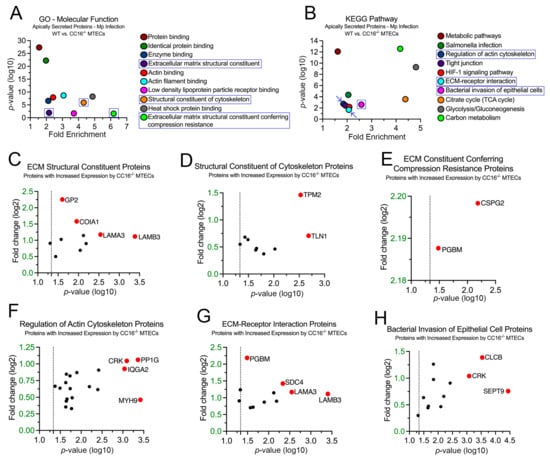 CC16−/− MTECs have increased secretion of proteins related to airway remodeling during Mp infection. Scatter plots of the Gene Ontology (GO)–Molecular Function (A) and KEGG pathway (B) enrichment findings for the proteins with significantly increased expression by the CC16−/− MTECs during Mp infection. GO and KEGG enrichment terms of interest are highlighted in blue. All proteins corresponding to the highlighted GO and KEGG enrichment terms—“ECM Structural Constituent” (C), “Structural Constituent of Cytoskeleton” (D), “ECM Conferring Compression Resistance” (E), “Regulation of Actin Cytoskeleton (F), “ECM–Receptor Interaction” (G), and “Bacterial Invasion of Epithelial Cell” (H)—were graphed to determine expression. Proteins of interest are highlighted in red and labeled.