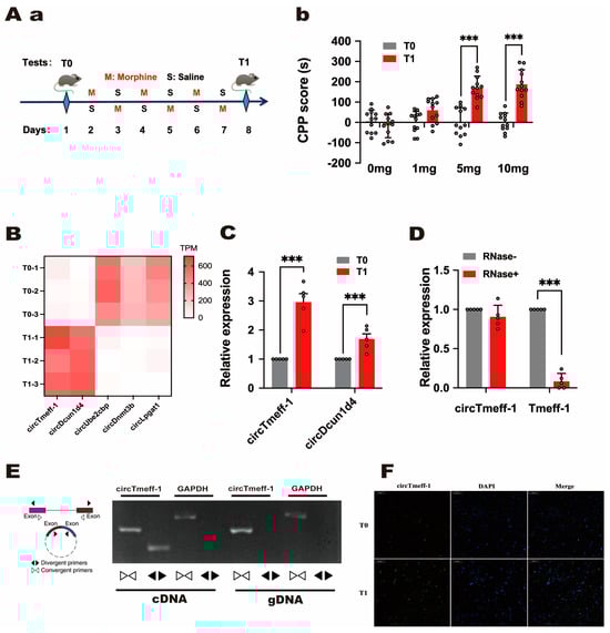 CircTmeff-1 expression increases during context-induced morphine seeking. (A(a)): a schematic diagram of the timeline of the morphine CPP training program. (A(b)): CPP scores increased significantly at T1 compared with T0 (n = 12 per group). *** p < 0.001. (B): Heat maps showed differences in circRNAs expression in the nucleus accumbens (NAc) at T0 and T1 (p < 0.01). (C): The expression levels of circTmeff-1 and circDcun1d4 in the NAc on T0 and T1 (n = 5). *** p < 0.001. (D): The expression levels of circTmeff-1 and mRNA Tmeff-1 in the NAc after RNase R was administered, and the expression levels without RNase R were used as baseline (n = 5). *** p < 0.001. (E): CircTmeff-1 and GAPDH were amplified from cDNA and gDNA with divergent and convergent primers in the NAc cells of mice. (F): The RNA fluorescence in situ hybridization results demonstrated that the expression of circTmeff-1 (green) in T1 was increased compared with that in T0, and it could be seen that circTmeff-1 was mainly distributed in the cytoplasm. Scale bar = 50 μm.