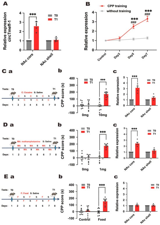CircTmeff-1 was increased in the NAc of morphine CPP mice. (A): At T1, circTmeff-1 expression increased in the core of the NAc but not in the shell (n = 5 per group). *** p < 0.001. (B): circTmeff-1 increased gradually during CPP training in mice, whereas circTmeff-1 expression did not change after intraperitoneal injection of morphine alone without training (n = 5 per group). *** p < 0.001 vs. control group; ### p < 0.001 vs. without training group on the same day. (C): (a) Timeline diagram of cocaine CPP training paradigm. (b) CPP scores increased at T1 compared with T0 (n = 10 per group). *** p < 0.001. (c) At T1, circTmeff-1 in the NAc was increased in mice with cocaine (10 mg/kg) CPP training (n = 5 per group). *** p < 0.001. (D): (a) Timeline diagram of methamphetamine CPP training paradigm. (b) CPP scores increased at T1 (n = 8 per group). *** p < 0.001. (c) Increased circTmeff-1 in the NAc of mice with methamphetamine (1 mg/kg) CPP at T1 (n = 5 per group). *** p < 0.001. (E): (a) Timeline diagram of CPP training paradigm for high-sugar foods. (b) CPP scores increased at T1 (n = 10 per group). *** p < 0.001 (c) At T1, circTmeff-1 expression in the NAc of mice trained with high-glycemic diet CPP did not change (n = 5 per group).