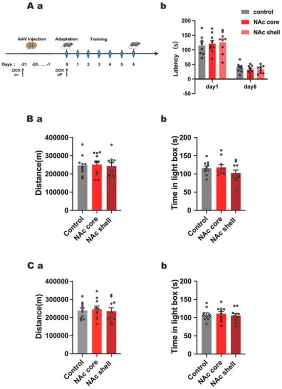 Since AAV may impair the spatial memory of mice, the Barnes maze test was conducted (Figure 4A(a)). The time spent by mice to find the target hole was not affected by microinjection of shcircTmeff-1 in the NAc. As the function of various circTmeff-1 expressions on CPP scores might be affected by the motor ability of mice, we administered a spontaneous locomotion test on T1. The analysis revealed no locomotion change in the mice with over-expression or with down-regulation of circTmeff-1 (Figure 4B(a),C(a)). Given that anxiety status might also affect CPP scores [], the light–dark box test was conducted. The statistical analysis demonstrated that the retention time of mice injected with adenovirus in the bright box revealed no difference, whether in core or shell (Figure 4B(b),C(b)).