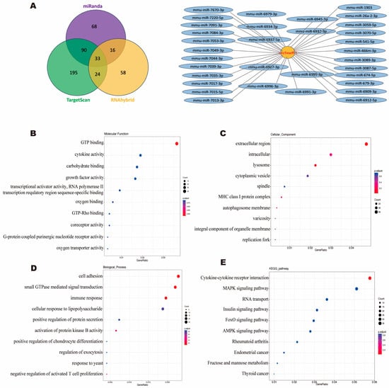 GO and KEGG analysis. (A): The prediction of downstream micro RNAs of circTmeff-1 using MiRanda, RNAhybrid, and TargetFinder tools. (B–D): Top 10 GO enrichment analysis, biological processes, cell component, and molecular function, in order. The x-coordinate represents GeneRatio, whereas the y-coordinate represents GO term. (E): Top10 enriched KEGG notes. Spot size represents the number of genes enriched, and blue to red represents the enrichment level in the corresponding item, from low to high.