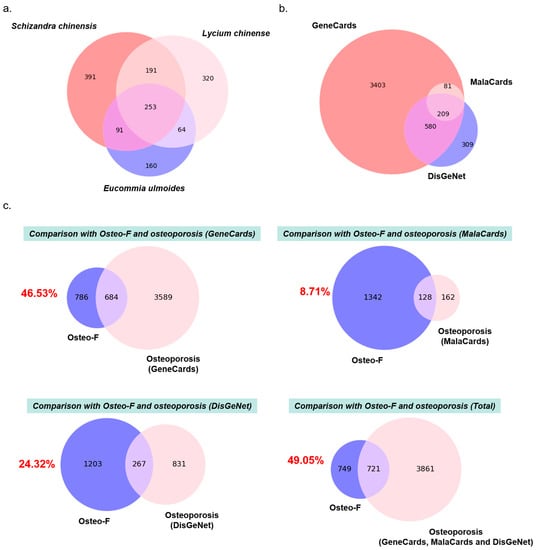 An integrated network analysis of Osteo-F. (a) Veen diagram showing overlapped genes between Schizandra chinensis, Lycium chinense, and Eucommia ulmoides. (b) Veen diagram showing overlapped genes of osteoporosis derived from GeneCards, MalaCards, and the DisGeNet database. (c) A comparison between Osteo-F and osteoporosis. Veen diagram of intersection targets between the Osteo-F network and the gene sets of osteoporosis.