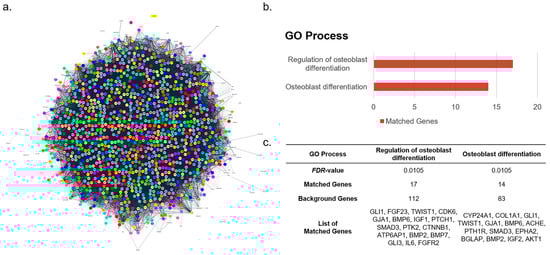 Functional target pathway of Osteo-F. (a) A network of Osteo-F with 1470 target genes derived from components of Schizandra chinensis, Lycium chinense, and Eucommia ulmoides. (b) Enrichment analysis extracted from the GO process of target genes of the Osteo-F network. (c) Detailed information of GO biological terms of “regulation of osteoblast differentiation” and “osteoblast differentiation” for the Osteo-F network.