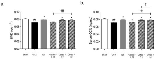 Compared to the sham group, a BMD loss in rats was observed in the ovariectomized (OVX) group. As shown in Figure 5a, the BMD levels of the femoral bone tissues were significantly increased in the OVX mice treated with 9 and 90 mg/kg of Osteo-F.