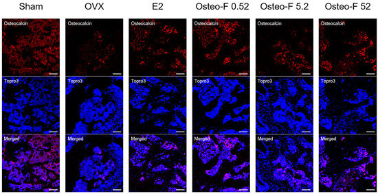 Immunofluorescence intensity of OCN expression in OVX-induced osteoporotic mice. Red, OCN; Blue, Topro3. The scale bar was 50 μm.