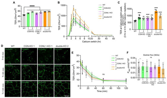 In summary, the KO of either CGN or CGNL1 or both resulted in a minor but significant increase in the TER values both in the steady state and during the calcium switch, but had no detectable effect either on the dynamics of TJ barrier assembly or disassembly or on the permeability of 3 kDa fluorescein-dextran.