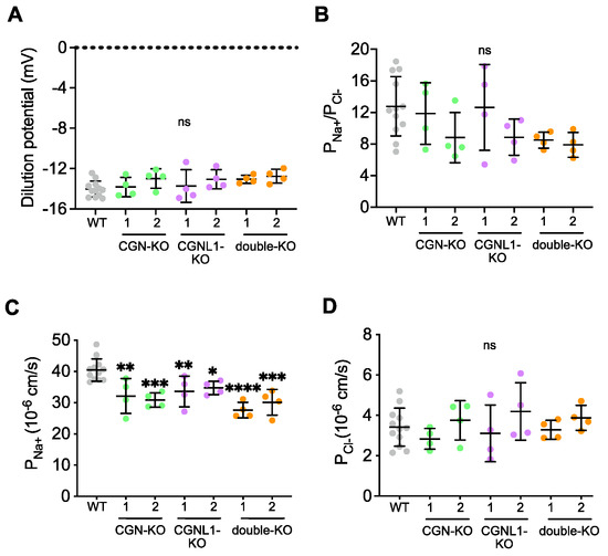To further characterize the barrier properties of WT, CGN-KO, CGNL1 KO, or double-KO monolayers, we determined the absolute and relative ion permeabilities of sodium (Na+) and chloride (Cl−) using the method of dilution potentials [36]. The dilution potential and the paracellular permeability ratio for Na+ over Cl− (PNa+/PCl−) were not significantly decreased in MDCK monolayers KO for either CGN or CGNL1 or both when compared to WT (Figure 2A,B). However, the absolute permeability to Na+ was significantly decreased in CGN-KO (decreased by 20.25% for clone 1 and 23.75% for clone 2), in CGNL1-KO (decreased by 17.12% for clone 1 and 14.23% for clone 2), and in double-KO (decreased by 31.75% for clone 1 and 25.55% for clone 2) compared to WT (Figure 2C). In contrast, the KO of either CGN or CGNL1 or both did not affect the absolute permeability to Cl− (Figure 2D).