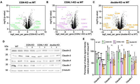MDCK cells KO for either CGN or CGNL1 or both show decreased claudin-2 protein expression. (A–C) Volcano plots illustrating claudin mRNA levels in MDCK WT versus CGN-KO clone 1 (A), in WT versus CGNL1-KO clone 1 (B), and in WT versus double-KO clone 2 (C). Fold changes of reads per gene (log2, x–axis) and corresponding p values (-log10, y axis) are plotted. (D,E) Immunoblot analysis (D) and relative densitometric quantifications (E) of protein levels of claudin-2, -3, -4, and -7 in lysates of WT, and KO for CGN, CGNL1, or both MDCK cells. (E) Genotypes and clone names are indicated on the x–axis. β-tubulin was used as a loading control. Dots show three to four biological replicates and bars represent means ± SD. Statistical significance of quantitative data was determined by a one-way Anova (ns: not significant, * p < 0.0332, ** p < 0.0021, *** p < 0.0002, **** p < 0.0001).