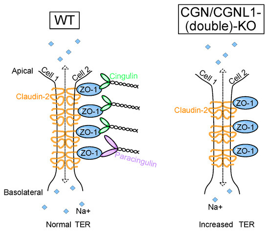 Simplified schematic model for the role of CGN and CGNL1 in barrier functions. (Left panel): organization of the TJ related to barrier function in WT MDCK. (Right panel): organization of the TJ related to barrier function in MDCK KO for CGN, CGNL1, or both.