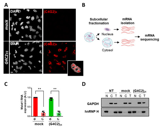 Isolation of nuclear and cytoplasmic fractions from cells expressing expanded G4C2 repeats to profile mRNA localization. (A) HeLa cells were transfected with a control empty plasmid (mock) or a plasmid coding for 31 repeats of the hexanucleotide G4C2 (G4C231). After 24 h, cells were subjected to fluorescence in situ hybridization (FISH) with a (C4G2)4 RNA probe conjugated to CY3. A high proportion of (G4C2)31-transfected cells show nuclear RNA foci, which are absent in control mock-transfected cells. A representative magnification of nuclear RNA foci merged with DAPI is also shown. Scale bar: 10 μm. (B) Schematics of the experimental workflow to isolate and profile mRNA distribution between the nuclear and cytosolic compartments. (C) RNAs extracted from nuclear (N) and cytosolic (C) fractions of transfected cells as in (A) were subjected to qPCR analysis of the nuclear lncRNA Malat1. Gapdh was used as a housekeeping gene. SD was calculated from n = 3 independent experiments. ** p < 0.01. (D). Equal volume of protein extracts from whole cells (T), nuclear (N), and cytosolic (C) fractions obtained from untransfected (NT) cells or transfected as in (A) were loaded on SDS-PAGE gel, in a volume ratio of 1:1:1 and analyzed via Western blot using antibodies that recognize nuclear (hnRNPH) and cytoplasmic (GAPDH) protein markers. A representative image from n = 3 independent experiments is shown.