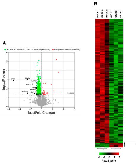 To extend our previous observations indicating that the nucleo-cytoplasmic distribution of mRNAs is affected by expanded G4C2 repeats [8], we used an RNA-Seq analysis to study the distribution of mRNAs in HeLa cells expressing an expanded (G4C2)31 RNA repeat. This cellular approach reproduces ALS-relevant phenotypes such as RNA foci (Figure 1A) and alterations in mRNA trafficking [8]. To this aim, nuclear and cytoplasmic RNAs from mock or C9orf72-transfected HeLa cells were extracted (Figure 1B). The efficiency of fractionation was assessed by following the distribution of specific proteins and transcripts in the different fractions via Western blot and qRT-PCR analysis (Figure 1C,D). RNAs prepared from each fraction were analyzed via mRNA sequencing, and the expression levels of 25,366 genes were obtained as a first read-out. After filtering (see the Materials and Methods section), we restricted the dataset to 9000 genes. We calculated the cytoplasm/nucleus (C/N) ratio of each identified RNA per sample and then the mean value between the three biological replicates. Then, we assessed the C/N ratios of mRNAs from cells expressing the expanded repeat and compared them to control cells (fold change, FC). This analysis led to the identification of 756 mRNAs that are differentially distributed between the two compartments in C9orf72 cells compared to control cells with a p-value ≤ 0.05 (Supplementary Table S2). As shown by the volcano plot and heat map, 729 of them are accumulated in the nuclei of C9orf72 cells (Figure 2A,B). On the contrary, only 27 mRNAs display cytoplasmic accumulation, suggesting that the nuclear retention of mRNAs is a major effect of C9orf72 expansion.