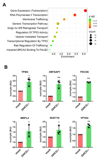 Pathway enrichment analysis of mRNAs retained in the nuclei of cells expressing G4C2 expanded repeats. (A) Pathway analysis of nuclear-retained mRNAs in (G4C2)31 expressing cells, carried out using Enrichr. The top 10 terms for Reactome pathway analysis are displayed based on decreasing −log10 p-values (enrichment). The color code shows the adjusted p-value, while the sizes of the bubbles represent the number of genes enriching the corresponding annotation (count). (B) HeLa cells were transfected with a control plasmid (mock) or a plasmid coding for (G4C2)31. Total RNAs were extracted from the purified nuclear and cytosolic fractions and analyzed via RT-qPCR analysis for the expression of the indicated mRNAs. GAPDH and malat1 were used as housekeeping reference mRNAs for the cytosolic and nuclear fractions, respectively. The ratio between the expression levels of a given RNA in each of the two fractions from G4C2-expressing cells was calculated and plotted considering the same ratio in control cells as 1. The SD was calculated from n = 3 independent experiments. * p < 0.05; ** p < 0.01.