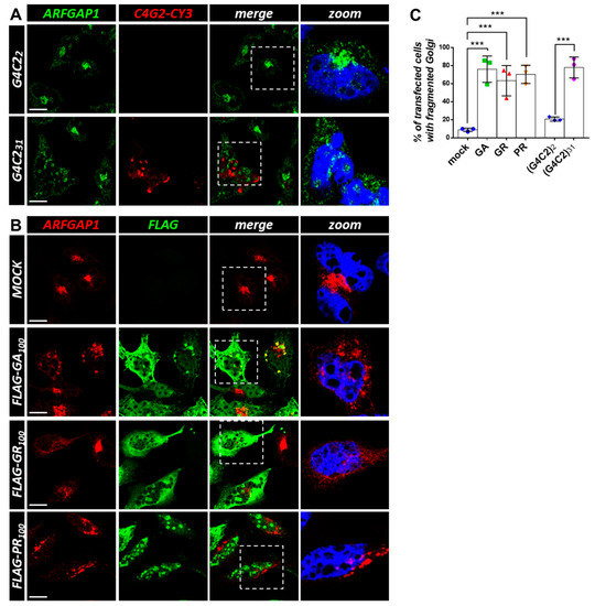 To confirm that the vesicular trafficking between Golgi and ER is a target of expanded C9orf72 repeat expression, HeLa cells were transfected with control and expanded (G4C2)31 repeats and subjected to an immunofluorescence analysis with an anti-ArfGAP-1 antibody coupled to a fluorescence in situ hybridization (FISH) analysis, using a Cy3-conjugated (C4G2)4 RNA probe. As shown in Figure 4A,C, in the presence of a control plasmid, ArfGAP-1 staining is concentrated in perinuclear tubular stacks in accordance with its known localization in the Golgi apparatus. On the contrary, in cells containing G4C2-positive nuclear foci, ArfGAP-1 staining is dispersed into smaller condensed structures throughout the cell. To verify whether the results obtained could be extended to C9orf72-derived DPRs, we transfected HeLa cells with plasmids expressing poly-GR, -PR, and -GA C9-DPRs, which are known to cause cell toxicity in a number of ALS model systems [26]. As shown in Figure 4B,C, the mock-transfected cells display perinuclear Golgi staining of ArfGAP-1. On the contrary, a significant fraction of cells expressing the transfected C9-DPRs show fragmented/dispersed ArfGAP-1-positive clusters, suggesting that C9-DPRs induce Golgi fragmentation similar to what is observed with the expanded C9orf72 repeats. To verify this, an antibody anti-GM130, a protein located on the cis-surface of the Golgi apparatus that is commonly used as a Golgi marker, was used to stain the cells transfected with G4C2 and C9-DPRs. The results in Figure 5A–C show a clear pattern of Golgi fragmentation/disorganization in cells expressing the ALS-linked C9orf72 constructs, which is consistent with what was observed with ArfGAP-1. Finally, a similar experimental setting was used to analyze the overall organization of the ER by using an antibody detecting KDEL epitope that characterizes ER-resident proteins and is used as an ER marker. As reported in Figure 6B,C, major effects are evident in cells expressing the C9-DPRs. Cells expressing poly-GA repeats specifically display condensed ER signals compared to the typical diffused perinuclear staining of the ER in the mock-transfected cells. Similarly, cells displaying G4C2 nuclear foci show signs of ER disorganization, though to a lesser extent (Figure 6A,C).