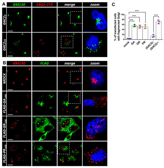 Both G4C2 expanded repeats and C9orf72-derived DPRs induce Golgi fragmentation. (A) HeLa cells were transfected with plasmids coding for control (G4C2)2 and expanded (G4C2)31 repeats. After 24 h, the cells were subjected to fluorescence in situ hybridization (FISH) with a CY3-(C4G2)4 RNA probe (red) coupled with an immunofluorescence analysis using an anti-GM130 antibody (green), a known Golgi marker. A merged image combining red and green signals is shown. Nuclei were stained with DAPI (blue), and representative magnifications of the highlighted areas (white dashed box) merged with the GM130 signal are shown (zoom). Scale bar: 10 μm. (B) HeLa cells were transfected with an empty plasmid (mock) or plasmids coding for FLAG-tagged C9orf72-derived DPRs. After 24 h, the cells were subjected to an immunofluorescence analysis with anti-FLAG (green) and anti-GM130 (red) antibodies. A merged image combining red and green signals is shown. Nuclei were stained with DAPI (blue), and representative magnifications of the highlighted areas (white dotted box) merged with the GM130 signal are shown (zoom). Scale bar: 10 μm. (C) The percentage of transfected cells with a fragmented Golgi apparatus is shown as the mean ± SD. At least 100 cells per condition in three independent experiments were scored. *** p < 0.001 via a one-way ANOVA versus the control cells is shown.