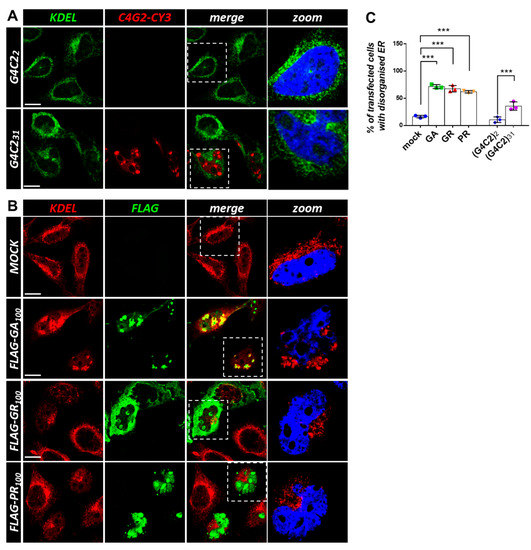 3.3. Expression of C9orf72 Expanded Repeats and DPRs Induces Golgi and ER Disorganization in Cell Lines