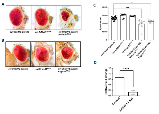 Building upon previous results, and to verify the functional implications of the alterations found, we used an in vivo model of C9orf72-ALS established in Drosophila melanogaster [27]. Thus, we employed the GAL4-UAS system to perform the RNAi-mediated downregulation of ArfGAP1 mRNA in fly tissues expressing C9orf72 toxic species. The RNAi constructs were expressed early during eye development (eyeless-GAL4). The Drosophila compound eye contains around 700 units (ommatidia) which follow a precise and repetitive pattern of differentiation. Even small alterations in eye organization or the number of ommatidia are easily detected. Since major alterations to eye development usually do not interfere with fly viability, it is possible to study the expression of any C9orf72 toxic species in this tissue [27]. Further, the Drosophila retina, which is composed of photoreceptors, neurons, and interneurons, is commonly used to study neurodegeneration [28]. As shown in Figure 7A,C, when we expressed 36 C9orf72 RNA repeats in the eyes of female flies under the control of eyeless-GAL4, although raised at 29 °C to achieve the highest expression levels of this RNA, the flies showed no sign of neurodegeneration. Similarly, the expression of the RNAi construct able to downregulate ArfGAP-1 mRNA, as confirmed via a qPCR analysis of RNAs extracted from the heads of flies (Figure 7D), did not cause any significant alteration in eye morphology. Most interestingly, when C9orf72 RNA expression was combined with ArfGAP-1 downregulation, we observed striking eye degeneration (Figure 7A,C), supporting a strong genetic interaction between C9orf72 RNA and ArfGAP-1. To confirm the functional link between Golgi-to-ER retrograde transport and C9orf72 toxicity, we downregulated the expression of ERGIC-53, another membrane trafficking factor which affects endoplasmic reticulum–Golgi intermediate vesicles compartment (ERGIC) (Figure 7B). Again, while the RNAi-mediated downregulation of ERGIC-53 does not affect eye morphology on its own, it causes a visible reduction in eye size when it is combined with C9orf72 expression (Figure 7B,C).