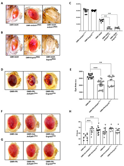 To confirm that the effect of C9orf72 RNA on the retrograde transport can be related to its ability to generate DPRs, we downregulated either ArfGAP-1 or ERGIC-53 in flies expressing 36 repeats of the GR dipeptide late during eye development under GMR-GAL4 at 25 °C [27], a condition that is sufficient to induce massive retina degeneration. Although 36 GR repeats cause strong degenerative phenotypes [27] (Figure 8A), they induce an even stronger reduction in eye surface that is associated with more severe neurodegeneration when combined with the downregulation of either ArfGAP-1 (Figure 8A,C) or ERGIC-53 (Figure 8B,C).