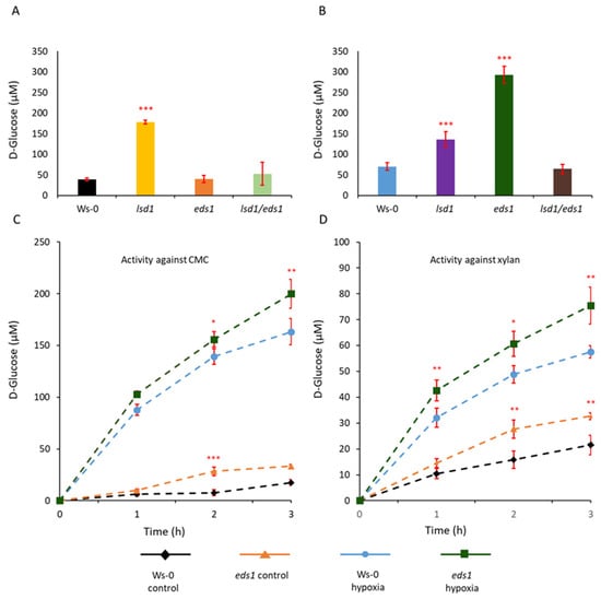 Two different substrates i.e., carboxymethyl cellulose (CMC) and beechwood xylan were added to proteins extracted from Ws-0 and eds1 hypocotyls. CMC is a substrate for β-D-glucanase hydrolyzing β-1-4 glycosidic linkages between glucopyranose units (in amorphous cellulose), while xylan is a substrate for xylanase acting on β-1-4 glycosidic linkages between xylopyranose units in xylan backbone. The Arabidopsis thaliana enzymes induced in roots and hypocotyls during hypoxia stress have the potential to break down both cellulose and xylan, however, proteins extracted from the eds1 mutant exhibited higher activity than those extracted from Ws-0 (Figure 1C,D). In contrast, enzymatic extracts from lsd1 and lsd1/eds1 double mutant exhibited lower activity against both CMC and xylan than eds1 mutant and wild-type plants (Figure S5A–D). The high reducing sugar content after the stress and stable enzymatic activity of extracts of eds1 mutant indicated that cellulase, xylanases and also cell wall loosening (CWL) proteins were intact and unaffected probably by endogenous proteolysis. Similarly, higher activity was observed in the protein extracts from eds1 in the Col-0 background examined in the zymography activity assay (Figure S4C; proteins were separated with Native-PAGE in the presence of 1% CMC as substrate). The ecotype Col-0 showed lower activity than Ws-0 (Figure S4C) and, in the same way, it was observed in the eds1 mutant. Generally, proteins with molecular weight higher than 150 kDa had enzymatic activity.