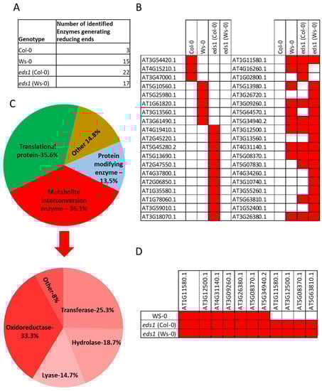 Identification of proteins isolated from roots and hypocotyls during lysogenic aerenchyma formation due to root hypoxia stress by the Maldi-TOF analysis. A number of enzymes generating reducing ends (A) and their presence in particular genotypes (B). Protein classes analysis by the Panther is shown as a pie chart presenting different protein classes taking part in root hypoxia stress response and their abundance among identified proteins in eds1 (Col-0) and a pie chart presenting the division of categories metabolite interconversion enzyme (PC00262) into subcategories (C). EDS1 abundance dependent generating reducing ends enzymes (D) Data are based on six separate experiments (biological replicates) and two technical repetitions per sample. The results were analyzed using the Mascot software and trimmed so there will be no more than 1% of false positives in each sample.
