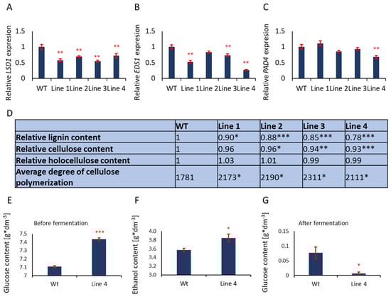 Integrated deregulation of PtLSD1, PtEDS1, and PtPAD4 affected lignin content and other wood chemical properties. Transgenic aspen trees (Lines 1–4) grew for four subsequent seasons in field conditions. The relative expression level of PtLSD1, PtEDS1 and PtPAD4 in leaves (A–C), relative lignin, cellulose, holocellulose content and a degree of cellulose polymerization (D), glucose content after saccharification of wood (E), the amount of ethanol in the fermentation process (F) and the amount of un-fermented glucose in the pulp after fermentation (G). Mean values (±SD) are derived for three different biological and three technical replications for each transgenic Line on graphs (A–C) (n = 9) and for three to six separate biological replications (n = 3 to 6) for data (D–G). Stars above the bars indicate statistically significant differences in comparison to the WT plants, according to Tukey HSD at levels p < 0.05 (*), p < 0.01 (**), and p < 0.001 (***).
