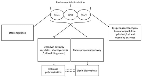 Hypothetical model of the role of LSD1, EDS1 and PAD4 in conditional regulation of the cell wall properties. Based on our results we propose the following model of the role of LSD1/EDS1/PAD4 trimer in conditional regulation of lignin biosynthesis and cellulose polymerization degree during plant growth in a natural environment. Both in Arabidopsis hypocotyls undergoing lisogenous aerenchyma formation proteomic analysis and from xylem/floem transcriptome analysis in transgenic Line 4, many proteins/genes from the phenylpropanoid pathway were deregulated (Tables S5 and S11). Knowing that this is one of the most important pathways in the lignin biosynthesis process we proposed this as the main reason for lower lignin content in the cell wall of transgenic aspen lines. The molecular/biochemical pathway of cellulose polymerization degree could be regulated by other unknown regulators (11%) as a response to transgenic deregulation of LSD1, EDS1 and PAD4. We hypothesize that a higher cellulose polymerization degree in transgenic Line 4 is a form of compensation for reduced lignin content.