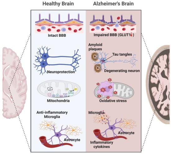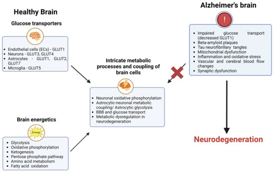 - GLUT1 is the primary glucose transporter in the brain, and its expression is reduced in the hippocampus and frontal cortex of AD patients compared to healthy controls [100,101,102]. This reduction in GLUT1 expression may contribute to the impaired glucose metabolism observed in AD [103,104].