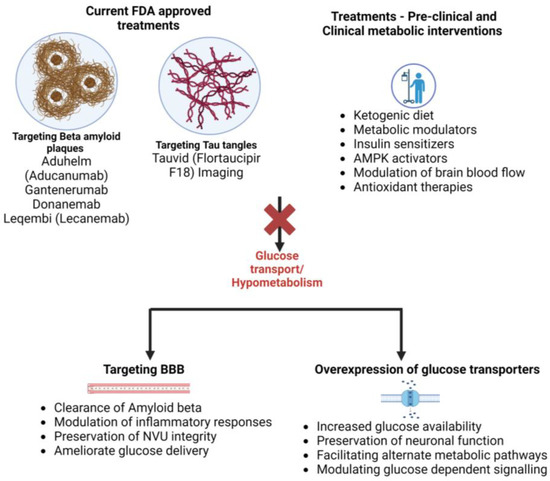 Current FDA-approved treatments and proposed targets for AD. In the past few years, the FDA has approved several drugs and treatments for AD, targeting the usual culprits, namely, beta-amyloid plaques and tau tangles. The potential therapeutic targets for hypometabolism in AD include targeting the BBB and glucose transporter overexpression.