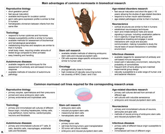 Main advantages of common marmosets in biomedical research (A) and cell lines required for the corresponding research areas (B).