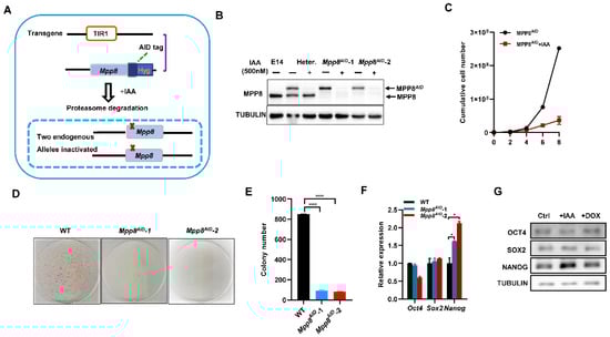 Next, we examined the role of MPP8 in the maintenance of ESCs. The degradation of AID-tagged MPP8 significantly impaired ESC proliferation (Figure 1C). Colony assay experiments revealed a noticeable decrease in colony formation in the absence of MPP8 (Figure 1D,E). Furthermore, the deletion of Mpp8 led to an increase in both the transcript and protein levels of Nanog expression, while Oct4 and Sox2 levels remained unaffected (Figure 1F,G).