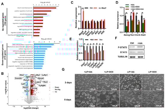 Mpp8’s role in ESC maintenance through Nanog regulation and the LIF/STAT3 pathway. (A) GO analysis revealing biological processes associated with differentially expressed genes upon MPP8 depletion in ESCs. (B) Volcano plot illustrating differentially expressed genes between WT and MPP8-depleted ESCs. Red dots represent genes upregulated in MPP8-depleted ESCs, while blue dots indicate genes downregulated in WT ESCs. Y-axis represents −log10 P values, and X-axis shows log2 fold change values. Volcano plot generated using GraphPad Prism version 8.2.0. (C) qPCR analysis of pluripotency genes in Mpp8-overexpressing ESCs(** p < 0.01). (D) qPCR analysis of specific genes in ex-Mpp8:Mpp8AID ESCs under different treatment conditions(* p < 0.05, ** p < 0.01). (E) qPCR analysis of LIF/STAT3 target genes in MPP8-depleted and Mpp8-overexpressing ESCs(* p < 0.05, ** p < 0.01). (F) Western blot analysis of STAT3 and p-STAT3 levels in control and MPP8-depleted ESCs upon IAA treatment. (G) Morphology of ex-Mpp8:Mpp8AID ESCs after 3 and 5 days of culture under different treatments. Scale bars: 100 μm.