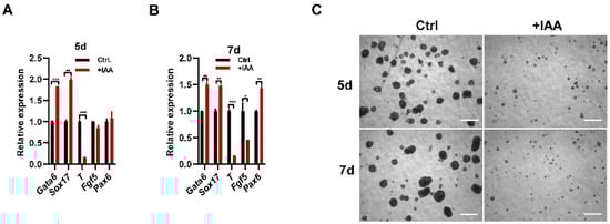 ESCs were cultured in a medium comprising DMEM (Procell, Wuhan, China, cat. no. WH0021U211) supplemented with 10% fetal bovine serum (Labtech, Beijing, China, cat. no. FCS-SA/500), 1% L-Glutamine (Gibco, Waltham, MA, USA, cat. no. 25030-081), 1% penicillin-streptomycin (Gibco, Waltham, MA, USA, cat. no. 15140-122), 0.1% β-Mercaptoethanol (Sigma, St. Louis, MO, USA, cat. no. M3148), and 103 U/mL mLIF (GenScript, Nanjing, China, cat. no. Z03077). For differentiation, ESCs were dissociated using 0.05% Trypsin-EDTA (Gibco, Waltham, MA, USA, cat. no. 2072820) and resuspended in ES medium without LIF. Approximately 6~8 × 105 ESCs were then plated in low-attachment Petri dishes and incubated at 37 °C with 5% CO2 to induce the formation of embryoid bodies (EBs). The EBs were collected at the indicated time for qPCR analysis.