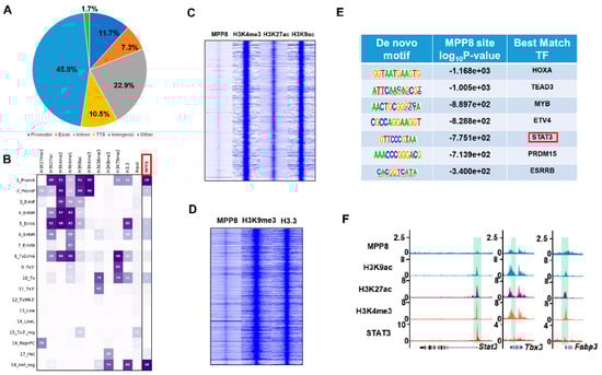 To elucidate the mechanism underlying the regulation of pluripotency genes, such as Nanog and LIF/STAT3 target genes, by MPP8, we conducted a comprehensive bioinformatics analysis to identify MPP8 binding sites across the genome [12,29]. Our analysis revealed that a significant proportion (45.9%) of MPP8 binding sites were localized within gene promoter regions (Figure 4A). Subsequently, we examined the epigenetic landscape of these binding sites and categorized them into 18 distinct categories based on specific epigenetic modifications [44]. Notably, MPP8 exhibited prominent enrichment in the first category, which corresponds to active promoter regions characterized by histone modifications such as H3K4me3, H3K27ac, and H3K9ac (Figure 4B,C). These findings suggest that MPP8 exerts its regulatory function by interacting with and modulating the activity of promoter regions.