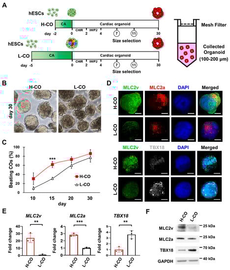 To address the effects of CA stemness and self-organization on cardiac differentiation and maturation in hESC-COs, we compared CAs which were formed for 2 days and highly expressed stemness markers with CAs which were formed for 5 days and were partially differentiated into three germ layers, as shown via qRT-PCR and immunostaining. We labeled the COs as follows: H-COs, COs generated from the 2-day-old CAs with high stemness, and L-COs, COs generated from the 5-day-old CAs with low stemness.