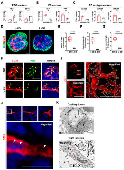 More ECs, EC subtypes, and capillary network formation with lumens are found in H-COs than in L-COs derived from H9 hESCs. qRT-PCR analysis of (A) EPC markers (TIE2 and CD117), (B) EC markers (CD31 and vWF), and (C) EC subtype markers (EFNB2, EPHB4, and PROX1) in H-COs and L-COs. n = 3. * p < 0.05. ** p < 0.01. (D) Immunofluorescence images of a total CM marker (cTnT; green) and an EC marker (CD31; red) in H-COs and L-COs. Scale bars = 20 μm. Quantification of (E) vessel percentage area, (F) junction density, and (G) average vessel length in H-COs and L-COs. Data were analyzed by quantifying CD31+ levels in five whole organoids. **** p < 0.0001. (H) Immunofluorescence images of CD31 (red) and vWF (green) in H-COs and L-COs. Yellow arrowheads indicate cells co-expressing CD31 and vWF. Scale bars = 20 μm. (I) Immunofluorescence images showing a vessel structure with a clear lumen (dashed white lines) and CD31+ endothelial tip cells (dashed yellow line) in H-COs. Scale bars = 20 μm. (J) Immunofluorescence images showing the formation of a lumen consisting of CD31+ ECs in H-COs. White arrowheads indicate the vascular lumen. Scale bars = 0.05 μm. (K) TEM images showing the formation of a vascular lumen (L), ECs (E), and tight junctions (thick red lines) in H-COs. Scale bars = 1 μm.