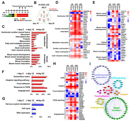 Transcriptome profiling indicates that the genes involved in CM maturation and vessel formation are upregulated in H-COs compared with those in L-COs from H9 hESCs. (A) Schematic of the transcriptome analysis of H-COs and L-COs on days 5, 15, and 25. (B) Venn diagram depicting the number of genes upregulated (red) and downregulated (black) > 2-fold between H-COs and L-COs on days 5, 15, and 25. (C) GO analysis of genes associated with CM maturation and vessel formation upregulated in H-COs compared with L-COs on days 5 (white), 15 (pink), and 25 (red). Clustered heatmaps of DEGs involved in (D) CM maturation and (E) vessel formation in H-COs and L-COs on days 5, 15, and 25. Pathway analysis of genes (F) upregulated in H-COs compared with L-COs on days 5 (white), 15 (pink), and 25 (red), and (G) downregulated in H-COs compared with L-COs on days 5 (white), 15 (sky blue), and 25 (blue). (H) Clustered heatmap of DEGs involved in ECM, integrin, focal adhesion, TGFβ signaling, and angiogenesis signaling in H-COs and L-COs on days 5, 15, and 25. (I) Network analysis of DEGs associated with CM maturation and vessel formation in H-COs compared with those in L-COs. Circles and lines represent genes and protein interactions between genes, respectively.