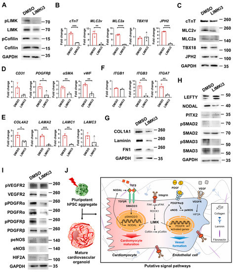 LIMK/Cofilin signaling pathways are critical for CM maturation and vessel formation during H-COs generation. (A) Western blotting images of LIMK/Cofilin signaling pathway (LIMK, pLIMK, Cofilin, and pCofilin) in H-COs treated with DMSO and LIMKi3. (B) Representative qRT-PCR analysis and (C) Western blotting images of cardiomyocyte maturation marker proteins (cTnT, MLC2v, MLC2a, TBX18, and JPH2) in H-COs treated with DMSO and LIMKi3. n = 3. ** p < 0.01. *** p < 0.001. **** p < 0.0001. (D) Representative qRT-PCR analysis of vessel formation markers (CD31, PDGFRβ, αSMA, and vWF) in H-COs treated with DMSO and LIMKi3. n = 3. * p < 0.05. ** p < 0.01. (E) qRT-PCR of ECM signaling pathway genes (COL4A2, LAMA2, LAMC1, and LAMC3) and (F) integrin genes (ITGB1, ITGB3 and ITGA7) in H-COs treated with DMSO and LIMKi3. n = 3. * p < 0.05. ** p < 0.01. *** p < 0.001. Western blot analysis of (G) ECM genes (COL1A, Laminin, and FN1), (H) TGFβ signaling genes (LEFTY, NODAL, PITX2, SMAD2, pSMAD2, SMAD3, and pSMAD3) and (I) angiogenesis genes (VEGFR2, pVEGFR2, PDGFRα, pPDGFRα, PDGFRβ, pPDGFβ, eNOS, peNOS, and HIF2A) in H-COs treated with DMSO and LIMKi3. (J) Schematic showing activation of LIMK/Cofilin signaling pathway via ECM-integrin interaction is critical for generation of mature and vascularized cardiac organoids derived from cell aggregates with high stemness.