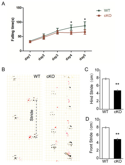 Then, we applied the rotarod test to assess the motor coordination of Thorase cKO mice at the age of 8 months. Although in the first three days no significant difference was observed between WT and cKO mice, the movement time on the rod of Thorase cKO mice was significantly lower than those of littermate WT mice on the day 4 and day 5 (Figure 1A). Meanwhile, Thorase cKO mice showed a phenomenon of holding rods in the limbs earlier during the experiment. This phenomenon indicates that cKO mice do not learn to or have a strength defect to stay on the rod. We then examined the footprint of mice at the age of 12 months. The results showed that the movement stride length of the forelimbs and hindlimbs of Thorase cKO mice was significantly shorter than that of the WT control mice (Figure 1B–D). In addition, the step width was significantly narrower (Figure 1B). Together, these behavioral phenotypes suggest that the motor coordination ability of Thorase cKO mice was impaired, exhibiting characteristics of cerebellar motor neurodegenerative diseases.