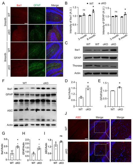 Previous studies have demonstrated that Purkinje cell apoptosis causes secondary inflammatory response in the Purkinje cell conditional knockouts in AFG3L2 mouse models [39]. Thus, we measured the distribution of activated microglia and astrocytes in the cerebellum regions from cKO mice and WT littermates using immunofluorescence staining with antibodies against Iba1 and glia fibroic acid protein (GFAP). The results showed that 3-month-old Thorase cKO mice exhibited slightly higher numbers of active microglia and astrocytes in the cerebellar molecular layer region than the of WT control mice (Figure 3A). However, in 8-month-old cKO mice, activated microglia and astrocyte were obviously higher than those in WT mice (Figure 3B). This finding was also validated using Western blotting. The expression of Iba1 and GFAP in brain tissues of 8-month-old Thorase cKO mice was significantly higher than that of their WT littermates (Figure 3C–E). In 12-month-old mice, we also observed the same phenomenon and a slight elevation of apoptosis-associated speck-like protein containing a CARD (ASC) protein expression (Figure 3F–I). Considering the small proportion of microglia, the difference in ASC protein may be masked by the background of other cell types, and immunofluorescence staining was used for further verification. The results showed that ASC spots appeared around the nucleus of cerebellar microglia of 8-month-old Thorase cKO mice, but not in WT littermates (Figure 3J). These results suggest that Thorase deficiency causes a cerebellar inflammatory response.