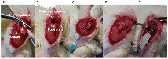 Representative pictures of the surgery process. (A) The supraspinatus tendon (white arrow) shown after the deltoid-splitting incision (white arrowhead) and division of the acromioclavicular joint. (B) The supraspinatus tendon (white arrow) was sharply detached from the greater tuberosity, and the footprint (white arrowhead) was gently decorticated. (C) Crossed bone tunnels were drilled at the anterior and posterior margins of the footprint and 2 mm lateral to the articular surface using a 22-gauge needle. (D) The suture end was passed through the bone tunnels and firmly tied over the humeral metaphyseal cortex, anatomically repairing the supraspinatus tendon to its native footprint. (E) For the SIRT6 overexpression experiment, adenovirus SIRT6 (Ad-SIRT6) was injected into the repaired cuff tendon.