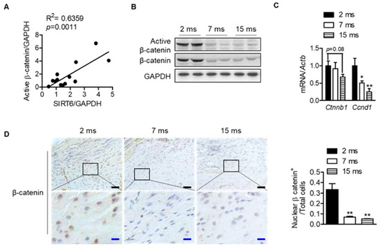 To understand the mechanisms between differentially expressed proteins and proteins related to the sirtuin signaling pathway, molecular network analysis was performed based on the Ingenuity Pathways Knowledge Database. The CTNNB1 gene encoding the β-catenin protein was predicted to be activated at the young age group by upstream regulator analysis of IPA (Z-score = 1; p-value of overlap = 4.08 × 10−3), suggesting that the expression of the CTNNB1 gene is inhibited at an old age group by regulating the expression of proteins including SERPINA1, BGN, CA3, and ENO3 (Figure S1). Interestingly, the protein expressions of SIRT6 in each human rotator cuff were significantly positively correlated with the protein expressions of active β-catenin, which is a key downstream effector in the Wnt signaling pathway (Figure 4A and Figure S2). Consistent with the results from human subjects, active β-catenin in the rat rotator cuff decreased similarly to SIRT6 expression, which was attenuated with age (Figure 3C and Figure 4B). Although the transcriptional level of β-catenin did not decrease significantly, the mRNA level of cyclin D1, the target gene of β-catenin, decreased significantly with age (Figure 4C). Furthermore, similar to SIRT6 expression, tenocytes and fibrochondrocytes expressed β-catenin in the nucleus of 2-month-old rats. However, those expressions were attenuated in old age (Figure 4D).