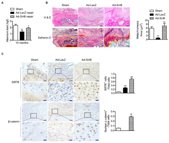 Next, to confirm the effect of SIRT6 on tendon-to-bone healing in the aged, we performed acute injury and repair of the rotator cuff in aged rats and infected the repair site with adenovirus SIRT6. The SIRT6-overexpressing group significantly restored the tensile strength of the supraspinatus tendon (Figure 6A). Furthermore, the metachromasia area was enlarged in the SIRT6-overexpressing aged group compared to the control group (Figure 6B). Consistent with the results of primary tenocytes, overexpression of SIRT6 increased the nuclear expression of β-catenin in the fibrochondrocytes region (Figure 6C).