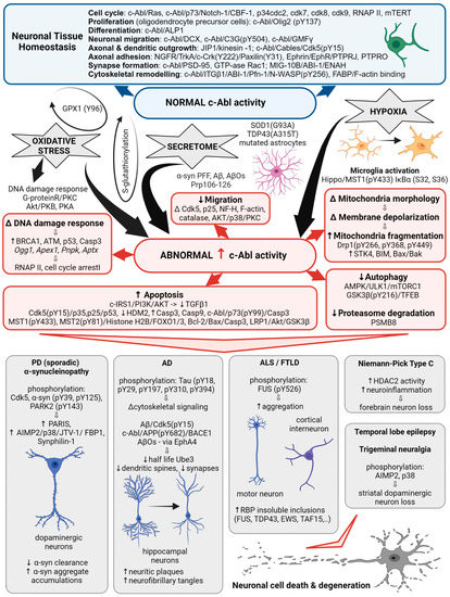 Oxidative stress, the most likely trigger of abnormal kinome activation, has long been implicated in the pathogenesis of ND [15] and has been reported as a major cause of sporadic PD [16], where it is responsible for much of the dopaminergic neuronal damage [17]. The ubiquitously expressed non-receptor tyrosine kinase c-Abl is activated by oxidative stress and plays a role in oxidative stress-induced neuronal cell death [18,19]. There it is even considered an indicator of oxidative stress [16,17]. Selenocysteine insertion sequence-associating factors, adenosine, Arg kinase and c-Abl kinase are all potent Se-independent regulators of expression and activity of glutathione peroxidase-1 (GPX1) gene/protein, which plays a protective role in neuronal cells in coping with oxidative damage [20]. Activation of c-Abl, with few exceptions, mostly negatively affects enzymes involved in antioxidant defense. Still, c-Abl can be modified by S-glutathionylation, and this reversible modification leads to the down-regulation of its kinase activity [11,21]. Inversely, depending on the oxidation level in the cell, glutathione peroxidase can also be activated via phosphorylation at Tyr96 by c-Abl [22]. Although the constitutively active form of c-Abl, Bcr-Abl, has a long history in myeloid and lymphoblastic leukemia, aberrant activation of c-Abl has emerged as a link between various triggers of oxidative stress relevant to PD, AD, FTLD and α-synucleinopathies [12,15,23]. Inhibition of c-Abl kinase activity by small molecule compounds used in the clinic to treat human leukemia showed neuroprotective effects in cell and animal models of PD [24]. Unfortunately, to date, several c-Abl kinase inhibitors have shown only sub-threshold efficacy in clinical trials [9,10], most likely due to limited knowledge of c-Abl signaling. Therefore, here we review the functions and effects of c-Abl in neuronal cells discovered to date to demonstrate how different aspects of c-Abl signaling contribute to the progression of neurodegenerative diseases. See Figure 1 and the following sections for an explanation.