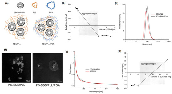 Although the development of nanotaxanes has recently been observed, the clinical application of PTX-based nanoformulations is significantly limited. The unsatisfactory drug release acquired resistance of cancer tissue and the off-target distribution of PTX loaded nanosystems are the main factors that decrease their therapeutic efficacy. For instance, Nanoxel® is incapable of selectively targeting and releasing the encapsulated PTX in tumour cells. Apart from Nanoxel®, other nanotaxanes such as Cynviloq®, Bevetex®, and Taxoprexin® have shown similar unsatisfactory results [19,36]. In our previous work, the application of the LbL technique for the possible synthesis of various nanocapsule cores containing nanoemulsion droplets was described [37]. During the manufacturing of such nanoemulsion cores, oil-soluble surfactants were used which, together with the oppositely charged polyelectrolyte, form an interfacial complex stabilizing the nanoemulsion droplet. This droplet, together with polyelectrolyte coatings formed by the LbL technique, creates a single core nanocapsule varying in size from 70 to 200 nm [38]. Here, the use of SDS as a water-soluble surfactant which with the oppositely charged polyelectrolyte can form a volume complex (nanomicelles/polyelectrolyte) was proposed. This complex forms the multicore polyelectrolyte NC, with the correct internal conditions for the encapsulation of hydrophobic drugs, e.g., taxanes. Therefore, in this study, newly invented polyelectrolyte multicore NCs consisting of micelles in water-soluble SDS with a solubilized lipophilic active agent PTX were developed. These biocompatible NCs were coated with an oppositely charged pair of polyelectrolytes, PLL and PGA, respectively. The SDS-based NCs, synthesised according to the LbL technique, were optimized for use as a DDS (Figure 1f). In addition, the active ingredient, in this case the hydrophobic anticancer drug PTX, was relatively easy to incorporate into the NC structure. Thus, we presumed that SDS/PLL as well as SDS/PLL/PGA nanosystems could actively deliver PTX directly to the tumour niche, mostly due to their bioavailability and the EPR effect in cancer tissue.